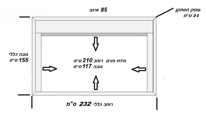 - מידות ע"פ תמונה מייצגת למסך עד 75 אינצ' מידות פנים : רוחב 178 ס"מ גובה 102 ס"מ , עומק המיתקן 24 ס"מ